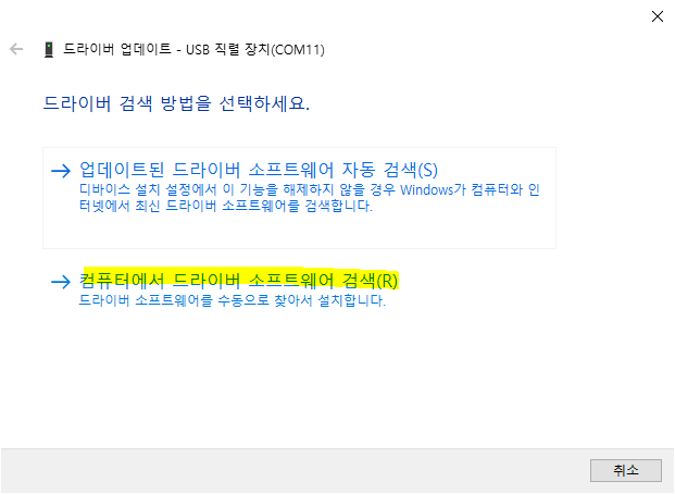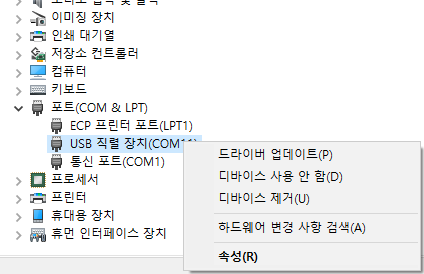 * USB 직렬 장치(COM11)에서 COM11을 기억해두셔야 합니다.