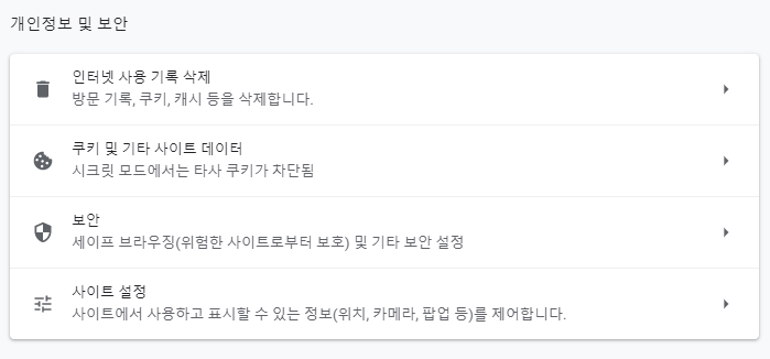 '개인정보 및 보안' 탭에서 '인터넷 사용 기록 삭제'로 진입합니다.