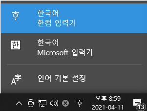 우선 작업표시줄 우측에서 'ᄒᆞ' 표시를 누른 후 '언어 기본 설정' 버튼을 눌러 설정으로 진입합니다.