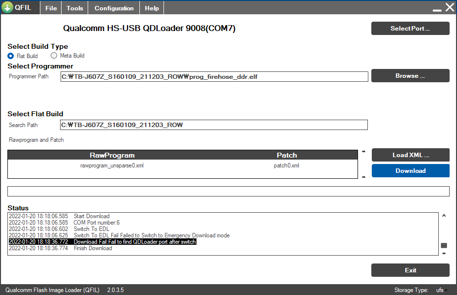 QFIL에서 정상적으로 EDL 모드 연결이 되었는지 확인합니다.
