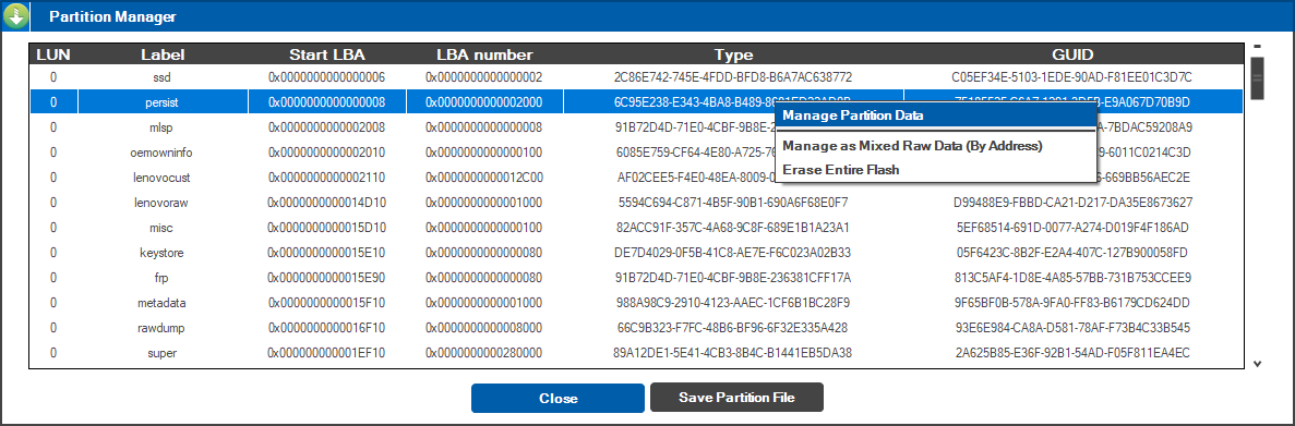 'persist' 파티션을 마우스 우클릭한 후 'Manage Partition Data'로 진입합니다. (persist 파티션은 기기 내의 wifi, mac, bluetooth 등의 정보와 함께 'widevine drm' 인증 정보가 저장되어 있습니다.)